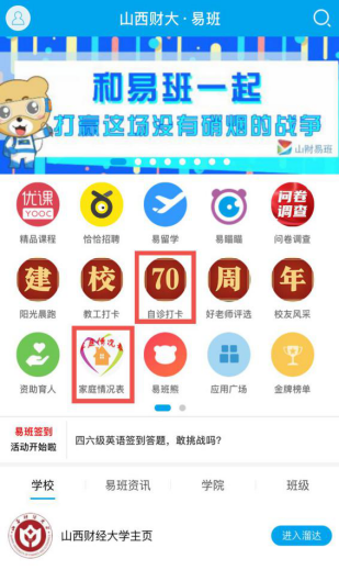 易班邀请函》要求进行注册,并从8月25日开始在家每天11:30前点击“新生打卡”完成每天的健康打卡,为防疫工作添砖加瓦少不了你的加入!